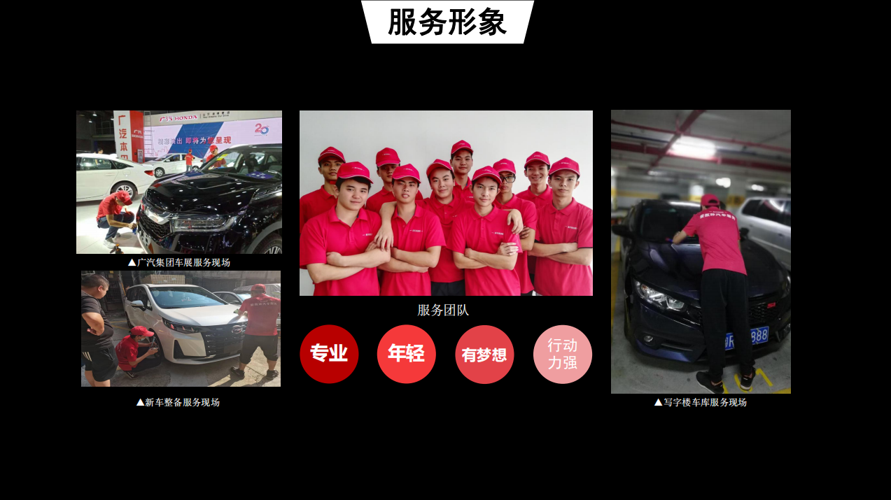 主营业务:门店展车试驾车的清洁维护,车展展车的清洁维护,服务中心维修车辆和保养车辆的清洁维护,定制洗车服务等。